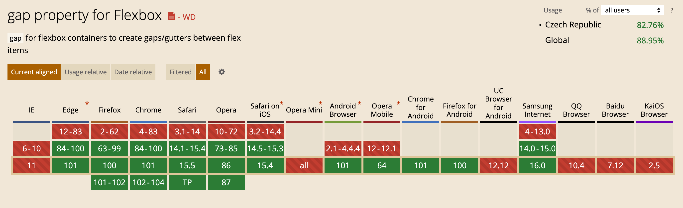 }Podpora gap pro flexbox je skvělá, znovu to trochu kazí jen alternativní mobilní prohlížeče: