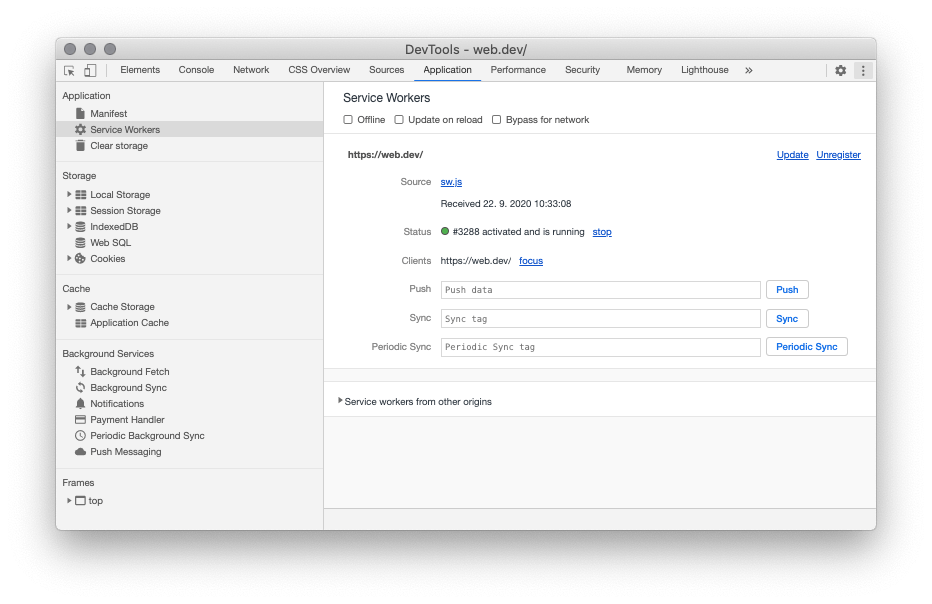 Jakmile máme service worker aktivní a neprovádí žádné operace, může nabývat dvou stavů: terminated, nebo fetching/messaging. Doporučuji bedlivě pracovat s DevTools, kde se pod záložkou Application skrývá sekce Service Workers, ve které můžete sledovat stav service workeru, a nejen to.