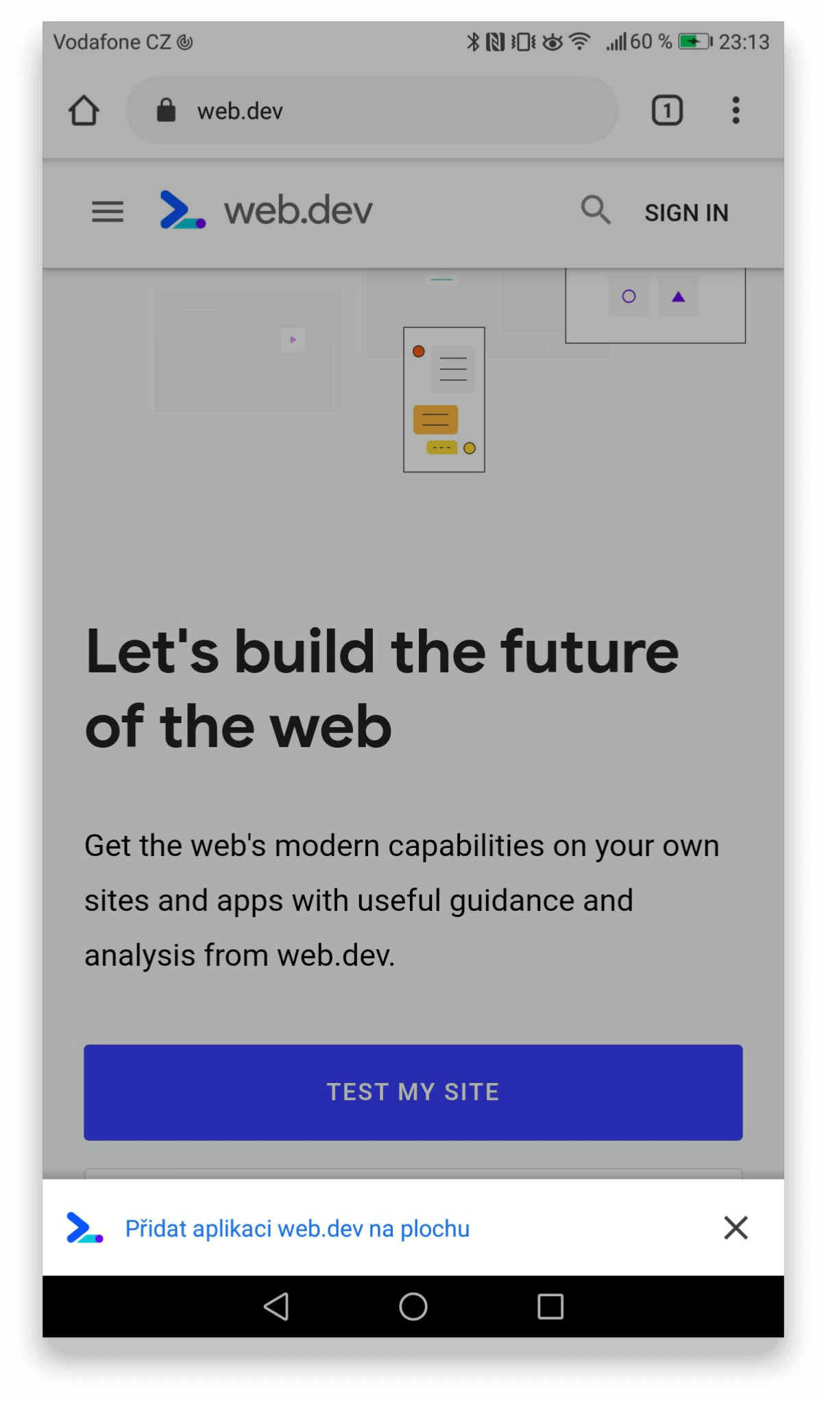 🎉 Voilà! Aplikaci by nyní mělo být možné nainstalovat na domovskou obrazovku a pracovat s ní (téměř) jako s nativní aplikací. Stačí jen při načtení webu potvrdit v banneru přidání stránky na domovskou obrazovku a pro příště už netřeba zadávat URL stránky do prohlížeče, nebo hledat v záložkách.