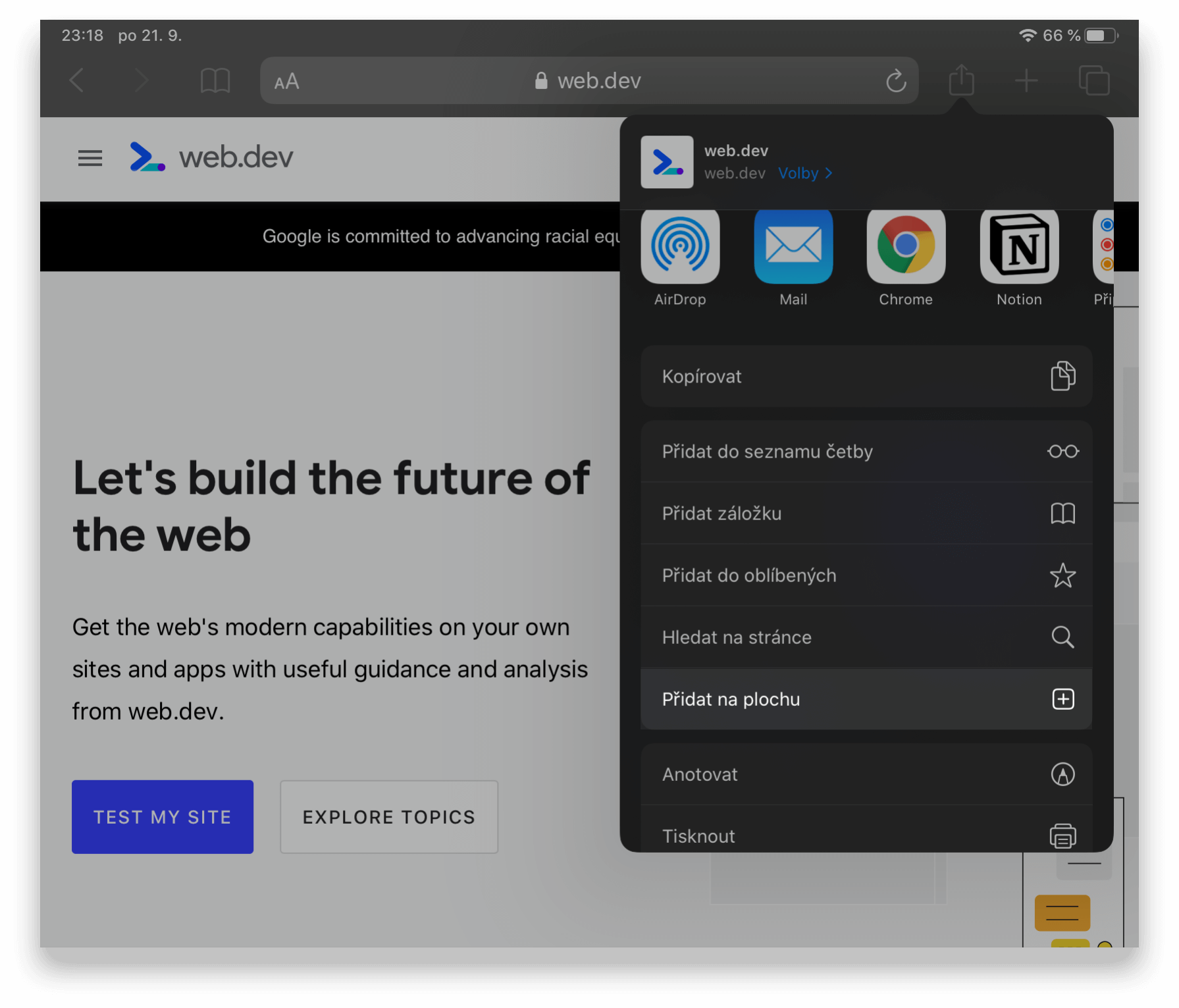 ⚠️ S iOS Safari je to poněkud komplikovanější, jelikož nepodporuje událost beforeinstallprompt, která nám zobrazí banner na instalaci/přidání aplikace, proto je třeba se proklikat přes Share Sheet. Apple v současnou chvíli neumožňuje A2HS ve webviews, kterými je například Chrome nebo Firefox.