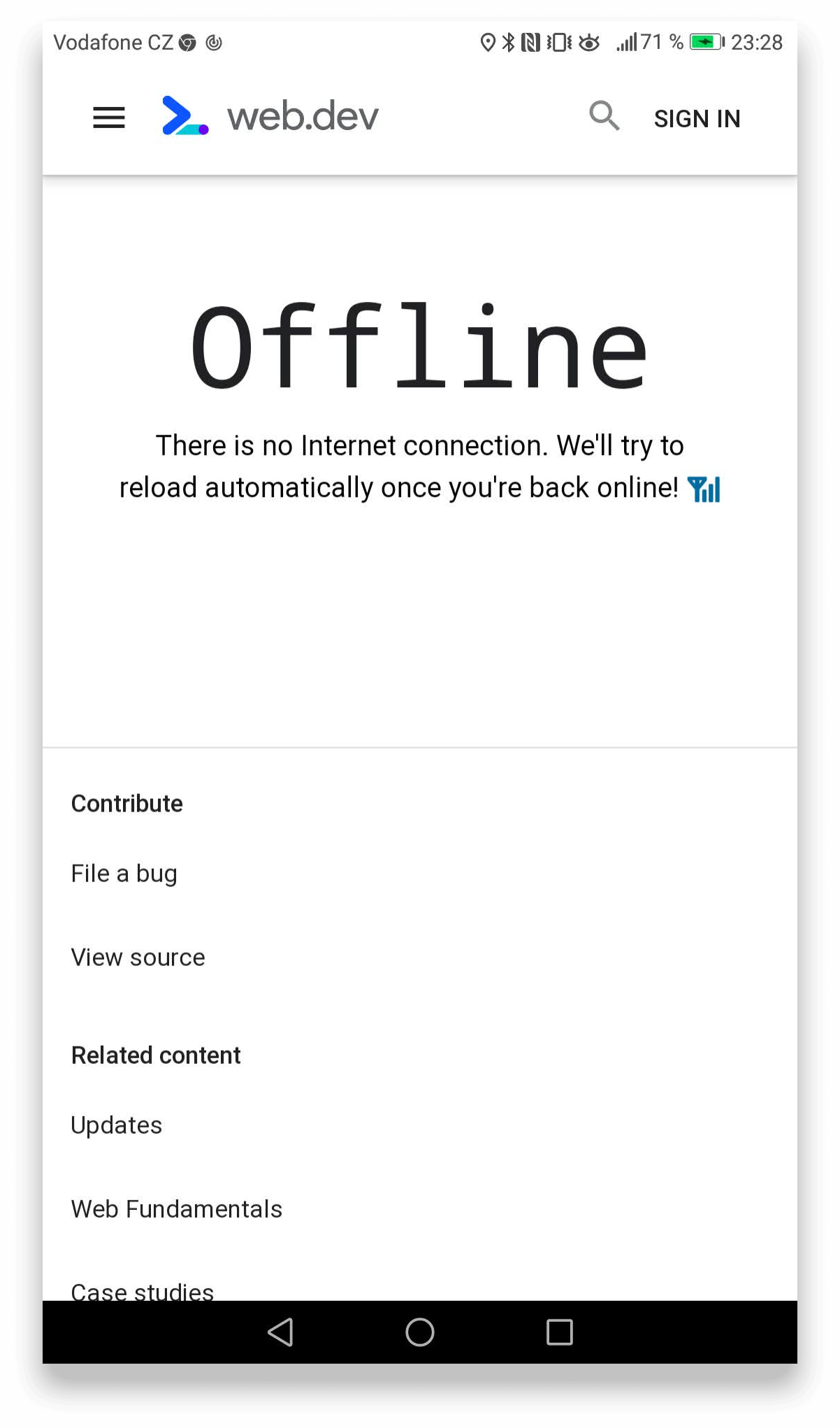 - Pokud nejsme připojeni k síti a chceme, aby naši uživatelé viděli něco lepšího než je skákající 🦖, vrátíme z cache vlastní offline stránku (viz níže).